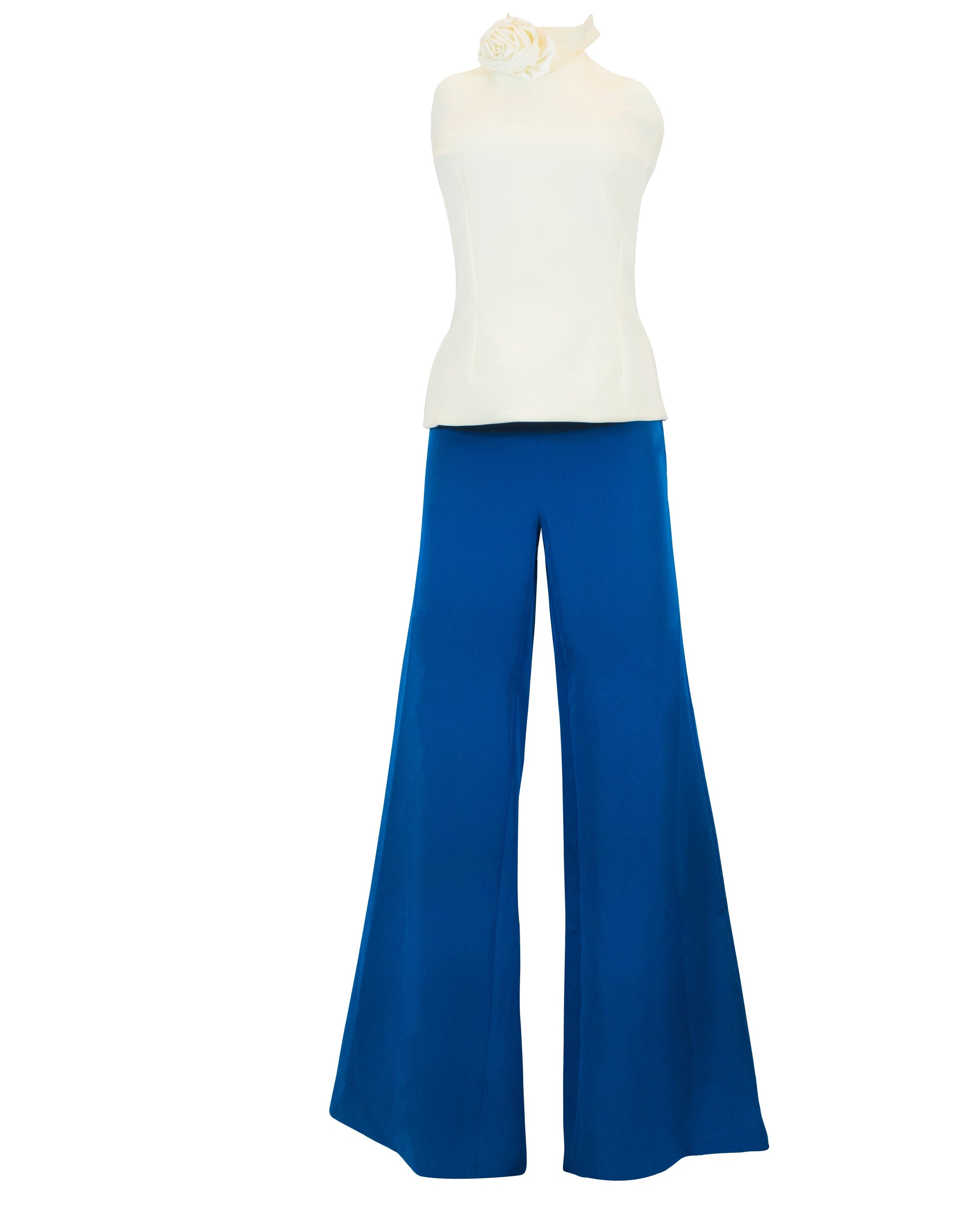 Conjunto blusa en color Ivory y pantalón Palazzo azul petróleo. Este conjunto es ideal para ocasiones formales o semi-formales, ofreciendo un equilibrio perfecto entre la sofisticación del ivory y la elegancia del azul petróleo. Es una opción chic y moderna que resalta con su combinación de colores y su diseño fluido.