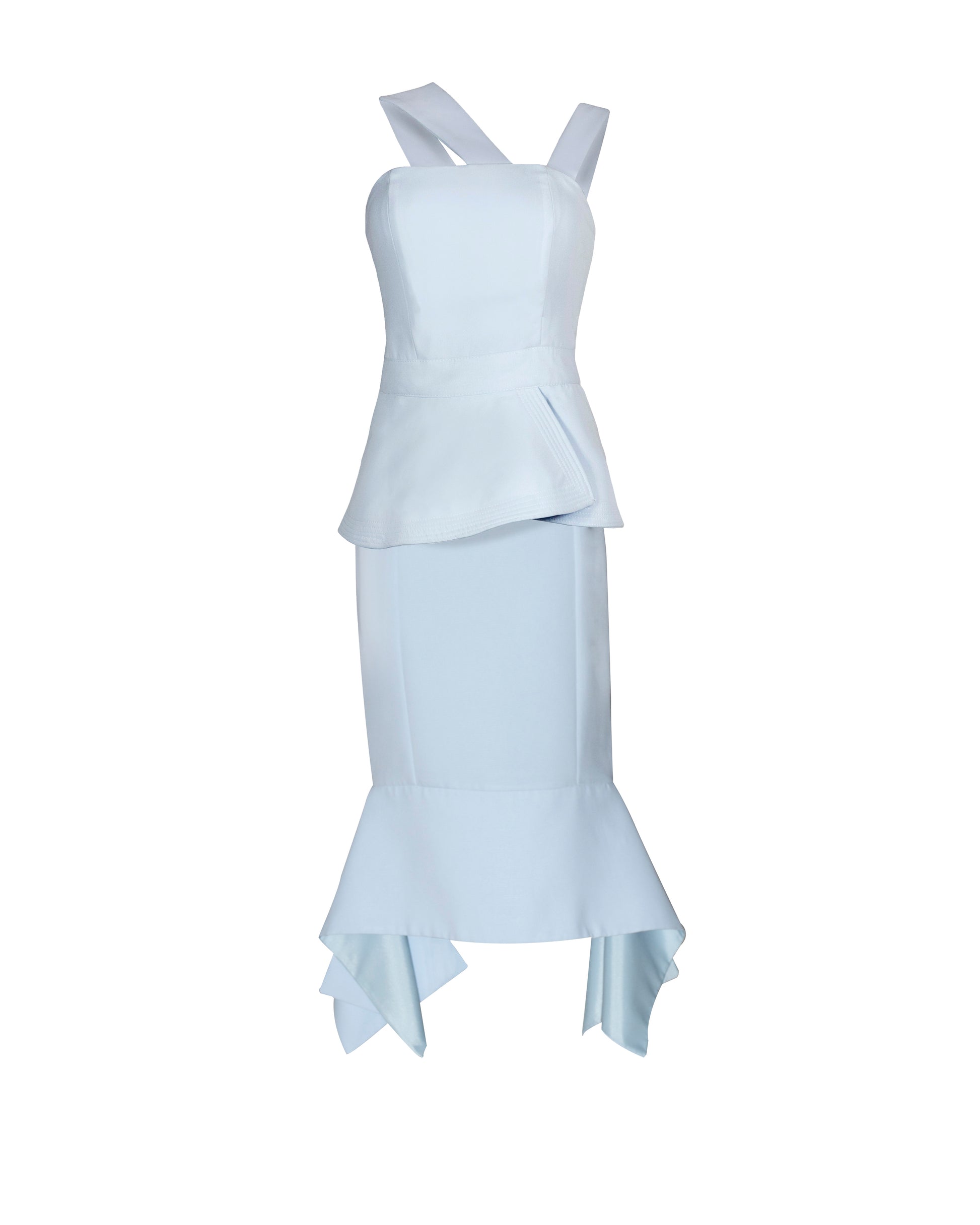 Conjunto blusa y falda en color baby blue. Este conjunto es una opción elegante y fresca, ideal para un coctel o evento en verano, ofreciendo un estilo elegante y cómodo que destaca por su frescura y modernidad, adecuado tanto para ocasiones formales como semi-formales.