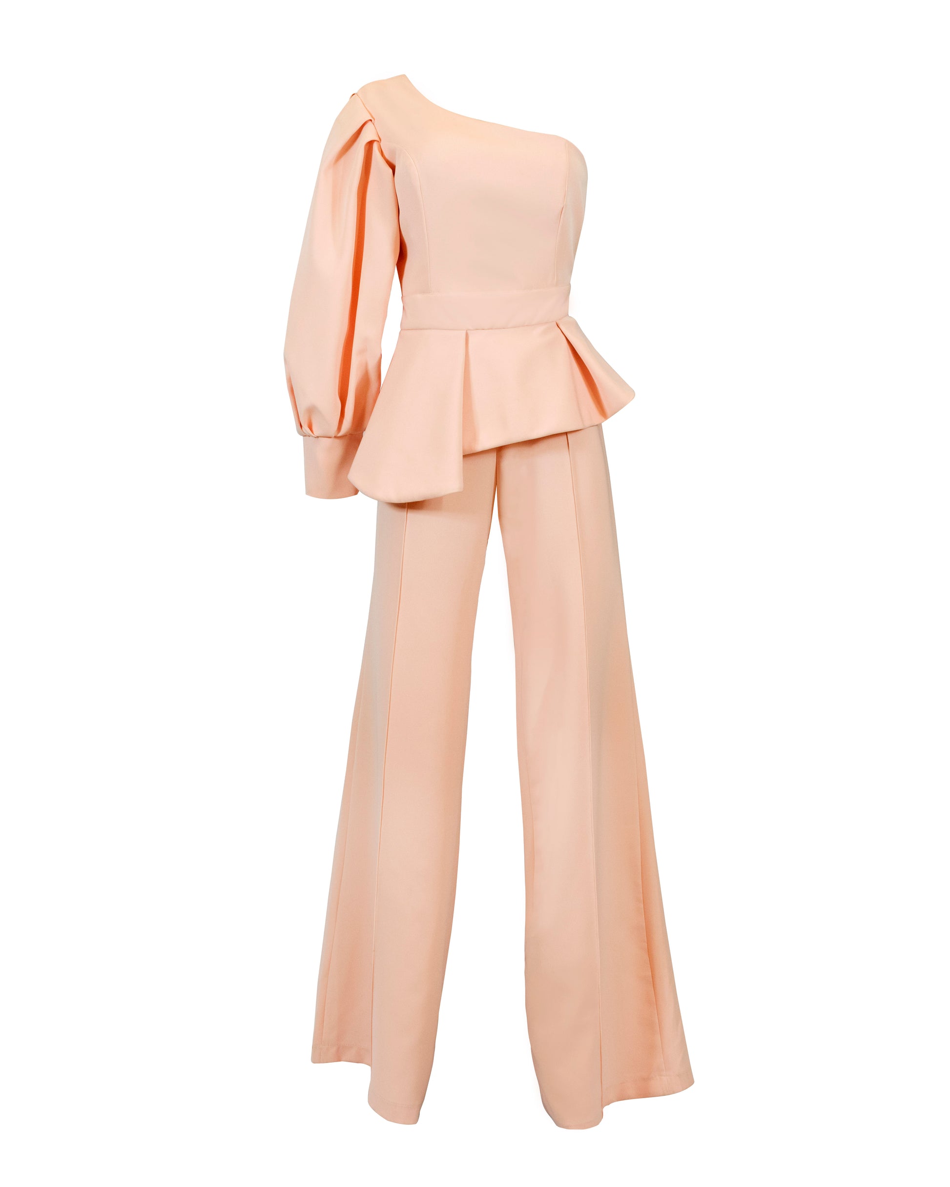 Conjunto en color palo rosa en tela Armani. Este conjunto es ideal para eventos formales, cenas elegantes o incluso para ocasiones de trabajo donde se desea un look sofisticado y contemporáneo. La combinación de la tela de alta calidad y el diseño asimétrico del top, junto con el pantalón estilizado, crea un equilibrio perfecto entre modernidad y elegancia.