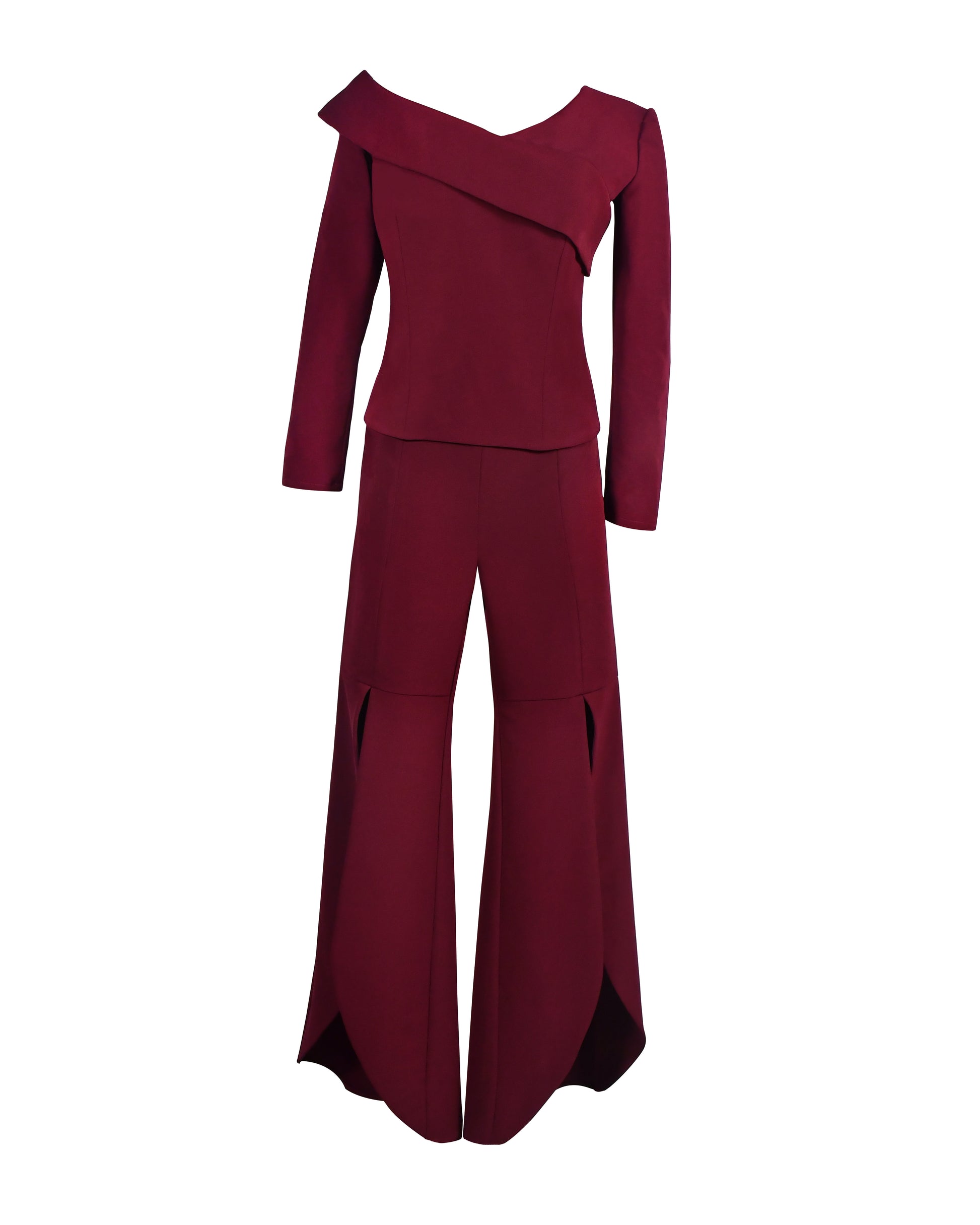 Conjunto en color Vinotinto con blusa y pantalón. Este conjunto es ideal para eventos formales, cenas elegantes o incluso para ocasiones de trabajo donde se desea un look sofisticado y contemporáneo. La combinación de la tela de alta calidad junto con el pantalón estilizado, crea un equilibrio perfecto entre modernidad y elegancia.