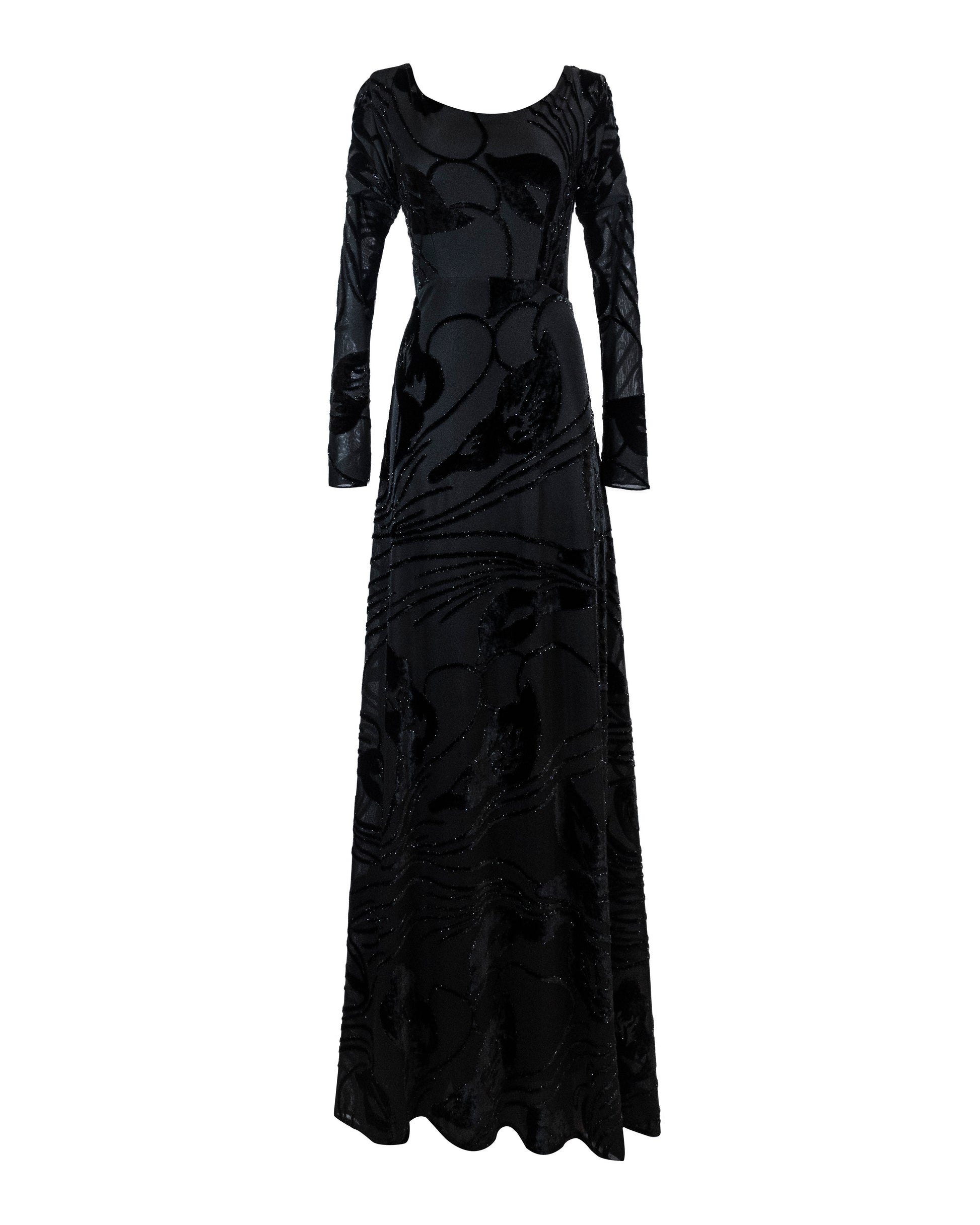 Este sofisticado vestido negro en lujoso terciopelo es una elección elegante y distintiva para cualquier ocasión especial. Con mangas largas que aportan un toque de elegancia clásica, el vestido presenta una textura rica y suave que resalta con un acabado opulento. La espalda descubierta añade un detalle atrevido y refinado, elevando el diseño a un nivel de sofisticación y sensualidad. Ideal para eventos nocturnos, galas o cenas formales, este vestido combina la profundidad del negro con la elegancia del terciopelo para crear una apariencia impresionante y memorable.
