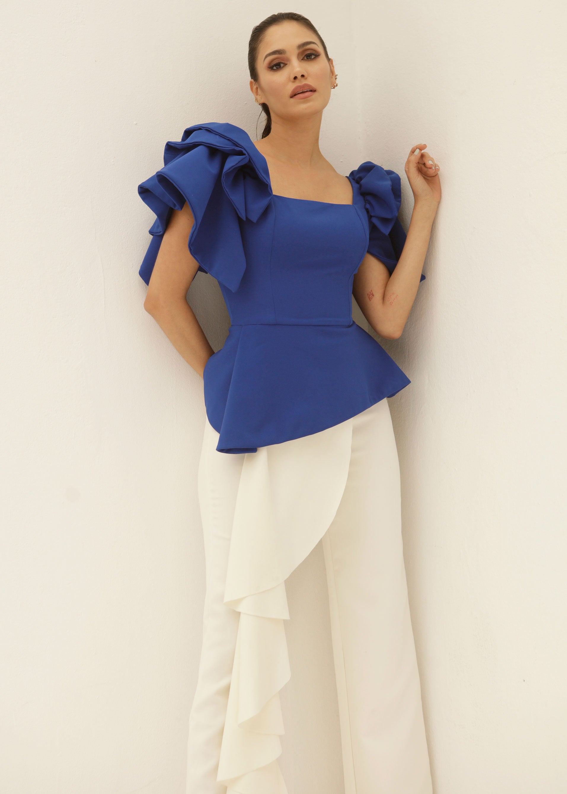 Crop top azul rey con boleros en hombros. Este top es una prenda llamativa y femenina que combina un color vibrante con un diseño romántico. Ideal para eventos casuales o semi-formales, salidas nocturnas o incluso para un look de día con un toque de elegancia.