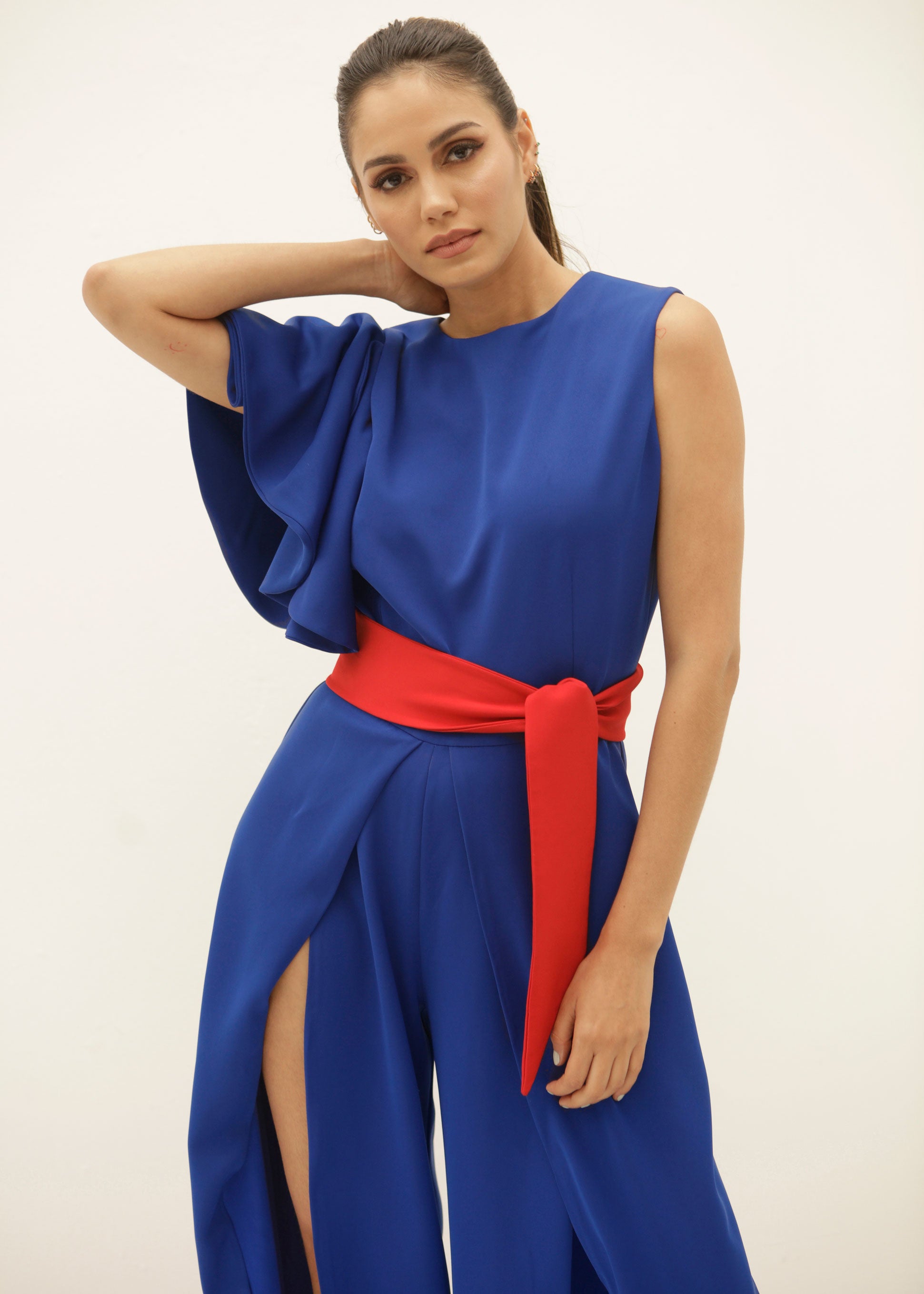 Este enterizo azul rey con fajón rojo es una pieza de moda que combina elegancia y sofisticación con un toque de color vibrante. Confeccionado en un tejido de alta calidad, el enterizo ofrece un ajuste impecable y una caída fluida que realza la figura de manera favorecedora. En resumen, este enterizo azul rey con fajón rojo es una opción excepcional para quienes buscan un conjunto que combine sofisticación, estilo y un toque de color vibrante.