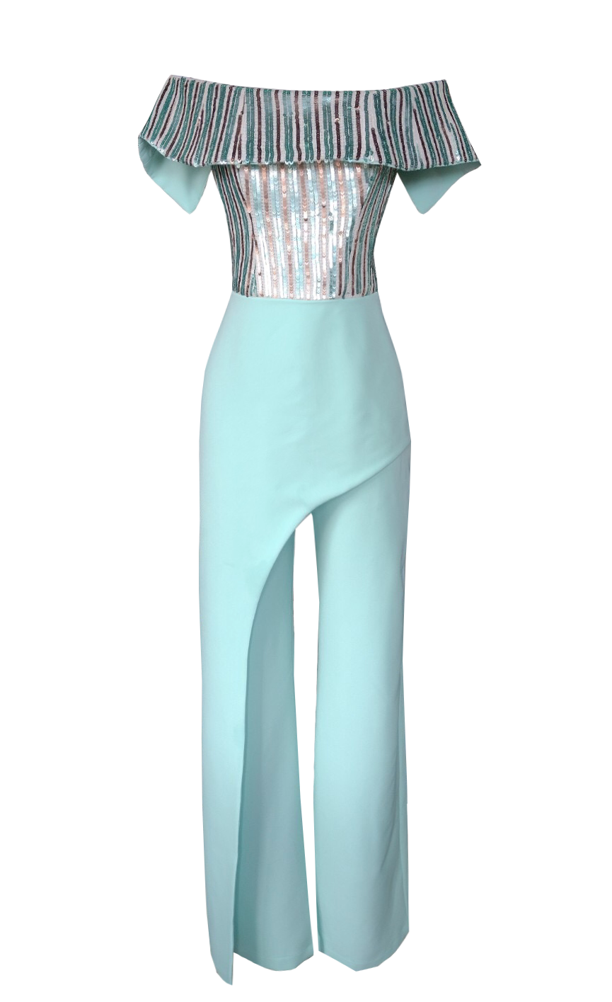 Este enterizo combina elegancia y sofisticación con un diseño que resalta en cualquier ocasión especial. Confeccionado en un tejido suave, el enterizo presenta un pantalón en un suave tono baby blue que ofrece una apariencia fresca y elegante. El color pastel proporciona una base delicada y versátil que se adapta a diversas ocasiones. La parte superior del enterizo está adornada con lentejuelas plateadas que capturan y reflejan la luz de manera deslumbrante. El brillo de las lentejuelas añade un toque de glamour y sofisticación, haciendo que este enterizo sea ideal para eventos nocturnos, fiestas y celebraciones.