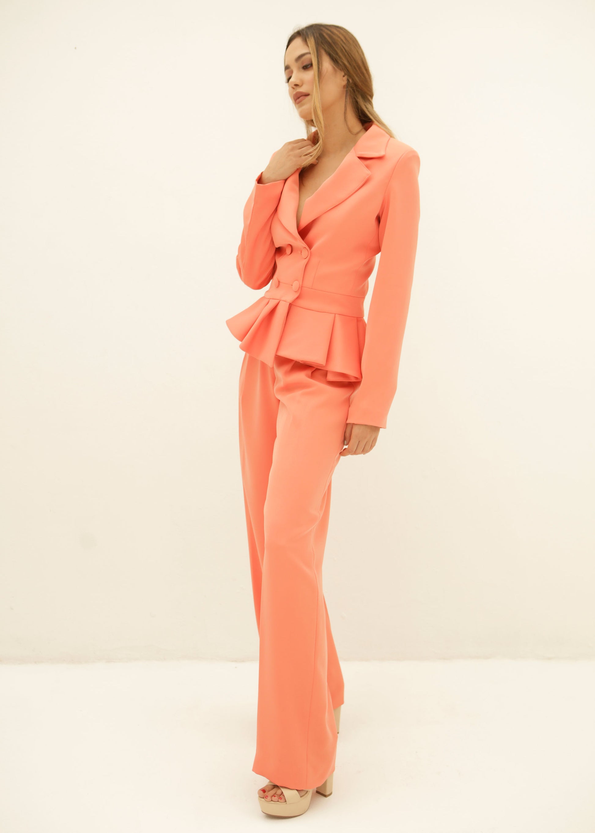 Este conjunto de blazer y pantalón en color salmón, confeccionado en tela Armani, ofrece una elegancia moderna y sofisticada. La tela Armani garantiza una caída impecable y una textura lujosa, mientras que el tono salmón aporta un toque de frescura y distinción. Ideal para eventos formales o profesionales, así como para ocasiones especiales donde se busca un estilo refinado y contemporáneo, este conjunto combina la calidad superior de la tela con un diseño atemporal.