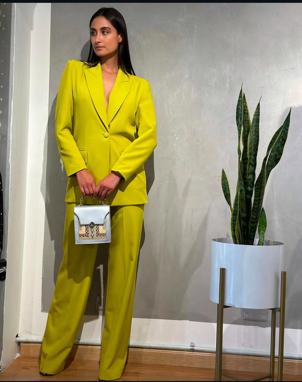 Este conjunto de blazer y pantalón en color verde lima, confeccionado en tela Armani, ofrece una elegancia moderna y sofisticada. La tela Armani garantiza una caída impecable y una textura lujosa, mientras que el tono verde lima aporta un toque de frescura y distinción. Ideal para eventos formales o profesionales, así como para ocasiones especiales donde se busca un estilo refinado y contemporáneo, este conjunto combina la calidad superior de la tela con un diseño atemporal.