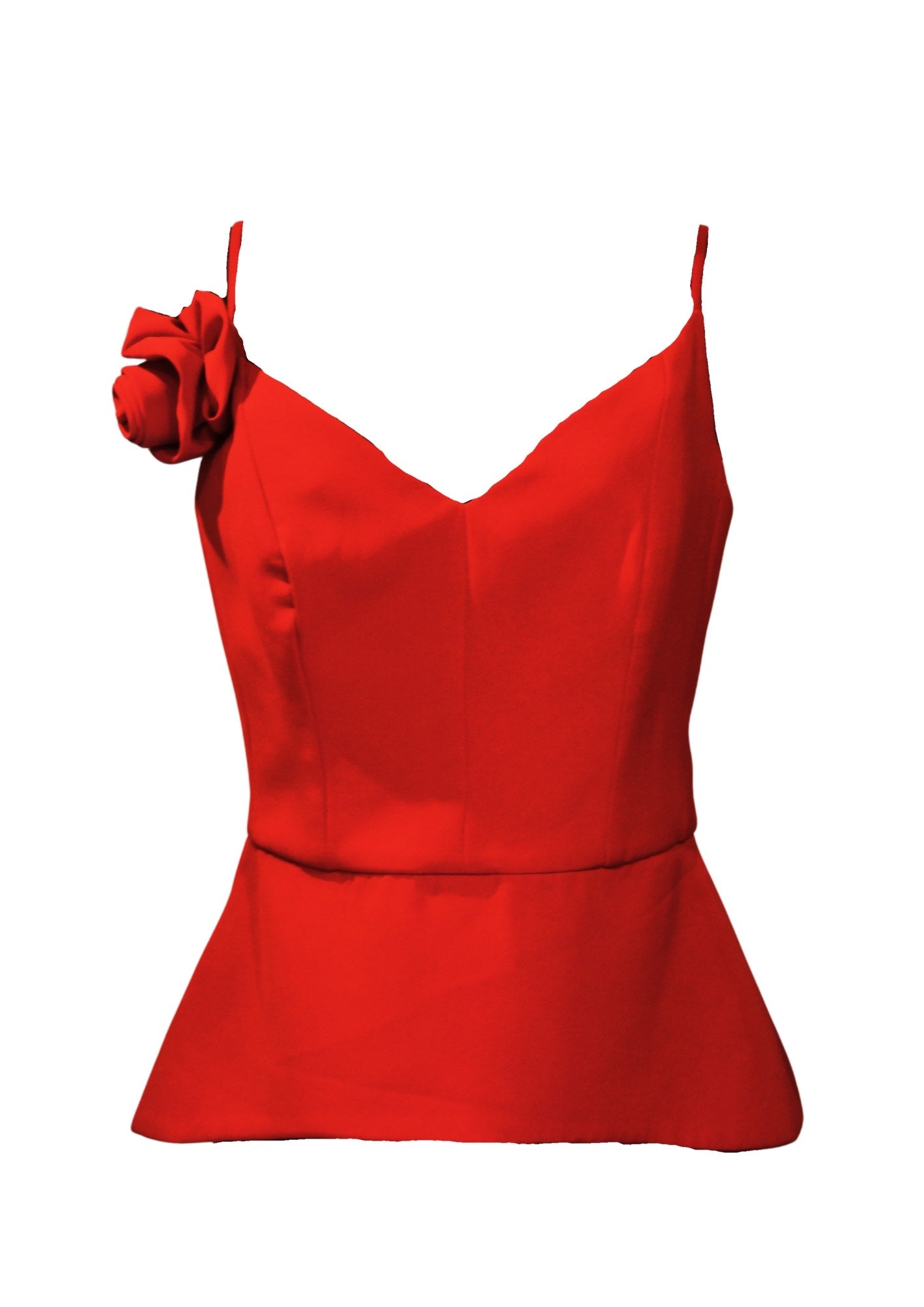 Este sofisticado top peplum en un vibrante rosa roja está confeccionado en lujosa tela Armani, lo que le otorga un acabado elegante y de alta calidad. Su diseño peplum realza la figura de manera favorecedora, mientras que una delicada flor pequeña adornando un lado del busto añade un toque de feminidad y distinción. Ideal para ocasiones especiales, cenas elegantes o eventos formales, este top combina perfectamente con pantalones ajustados o faldas, brindando un look chic y refinado.