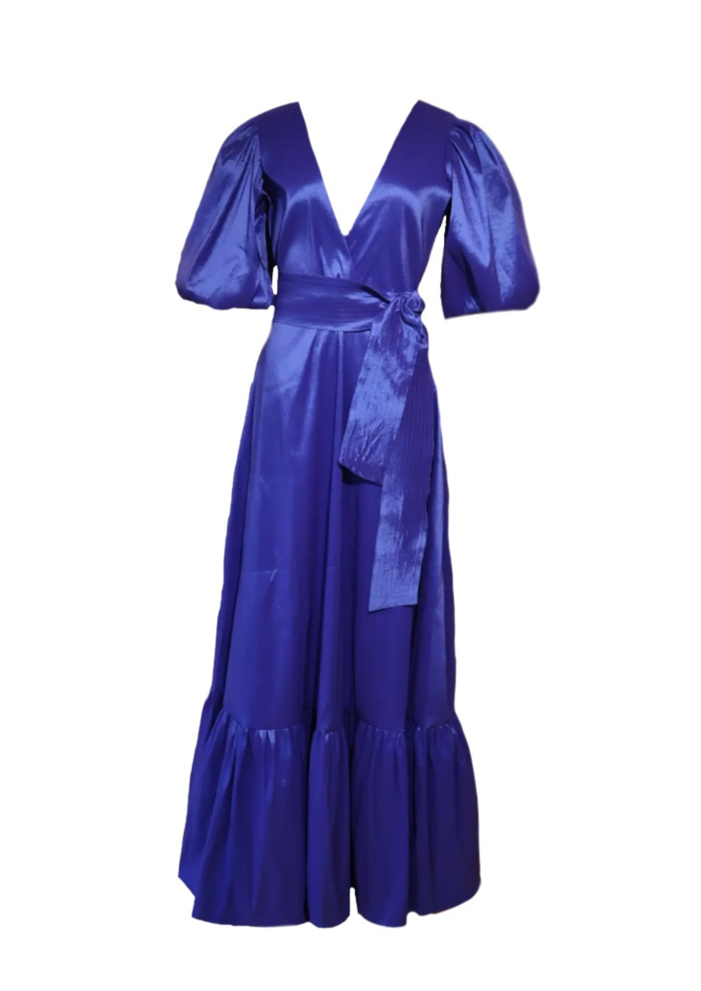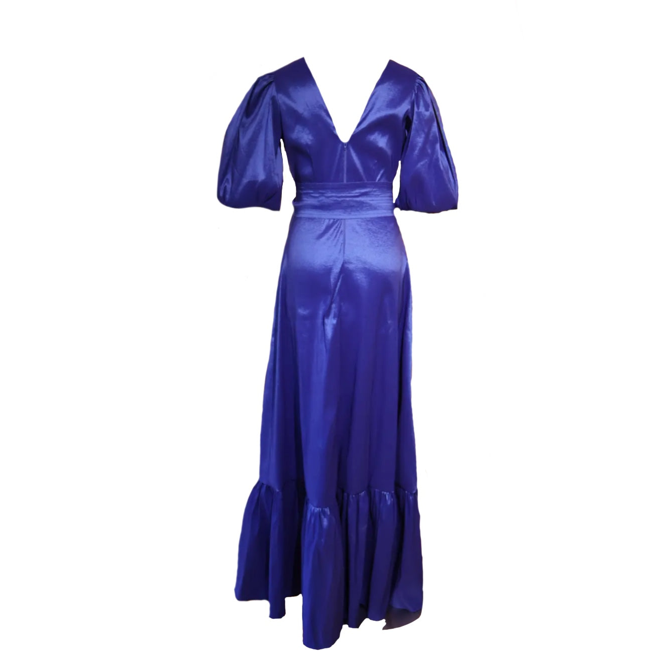 Un vestido largo de un intenso color azul, que combina elementos clásicos con un toque moderno. Su diseño envolvente, el escote en V pronunciado y las mangas abullonadas le dan un aire femenino y sensual. Perfecto para diversas ocasiones, desde eventos formales hasta salidas nocturnas.