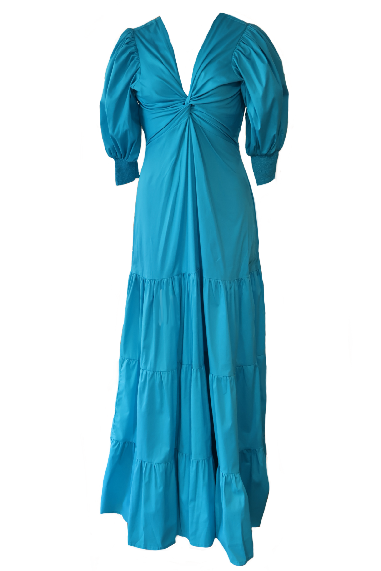 Vestido largo de algodón popelín en un vibrante tono turquesa. Presenta un escote en V pronunciado con un detalle de nudo en el centro, mangas cortas abullonadas y una falda voluminosa con múltiples capas que crean un efecto de movimiento. Diseño contemporáneo con reminiscencias de la moda boho-chic. La combinación del color intenso, las mangas abullonadas y la falda con vuelo le confiere un aire romántico y femenino.