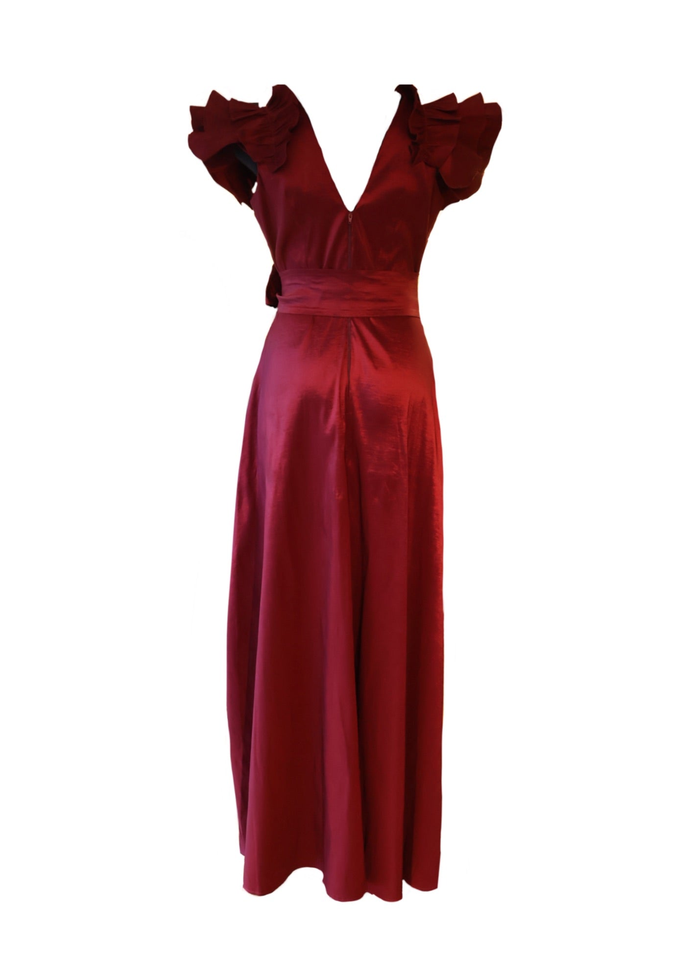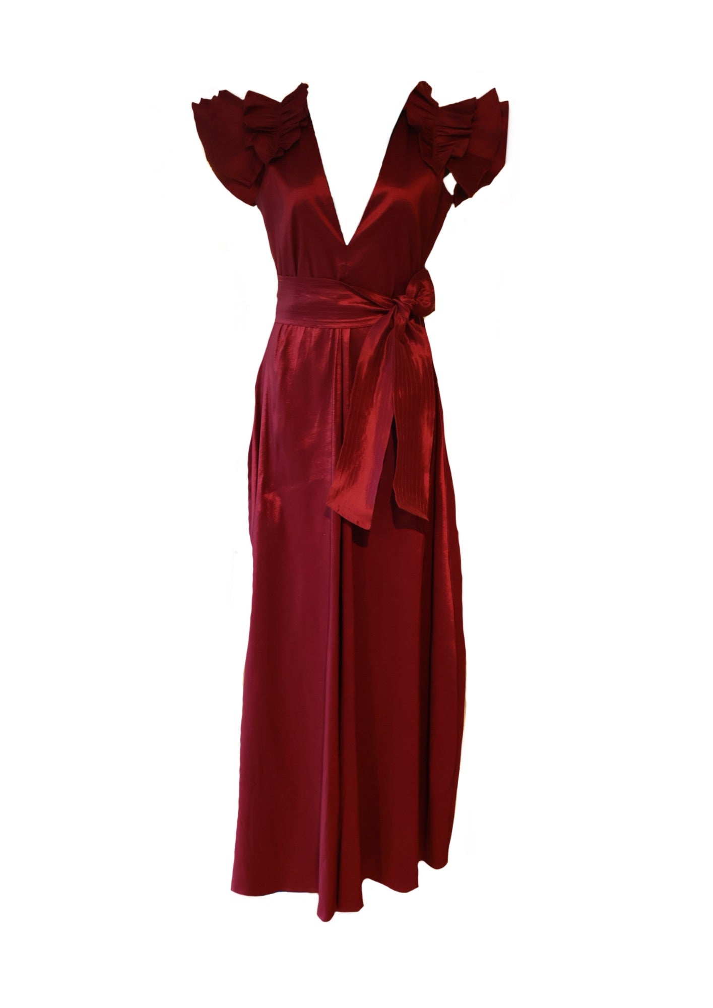 Un vestido midi de un intenso color borgoña, que combina elementos clásicos con un toque moderno. Su diseño envolvente y las mangas con volantes le dan un aire femenino y sensual. Perfecto para diversas ocasiones, desde eventos formales hasta salidas nocturnas