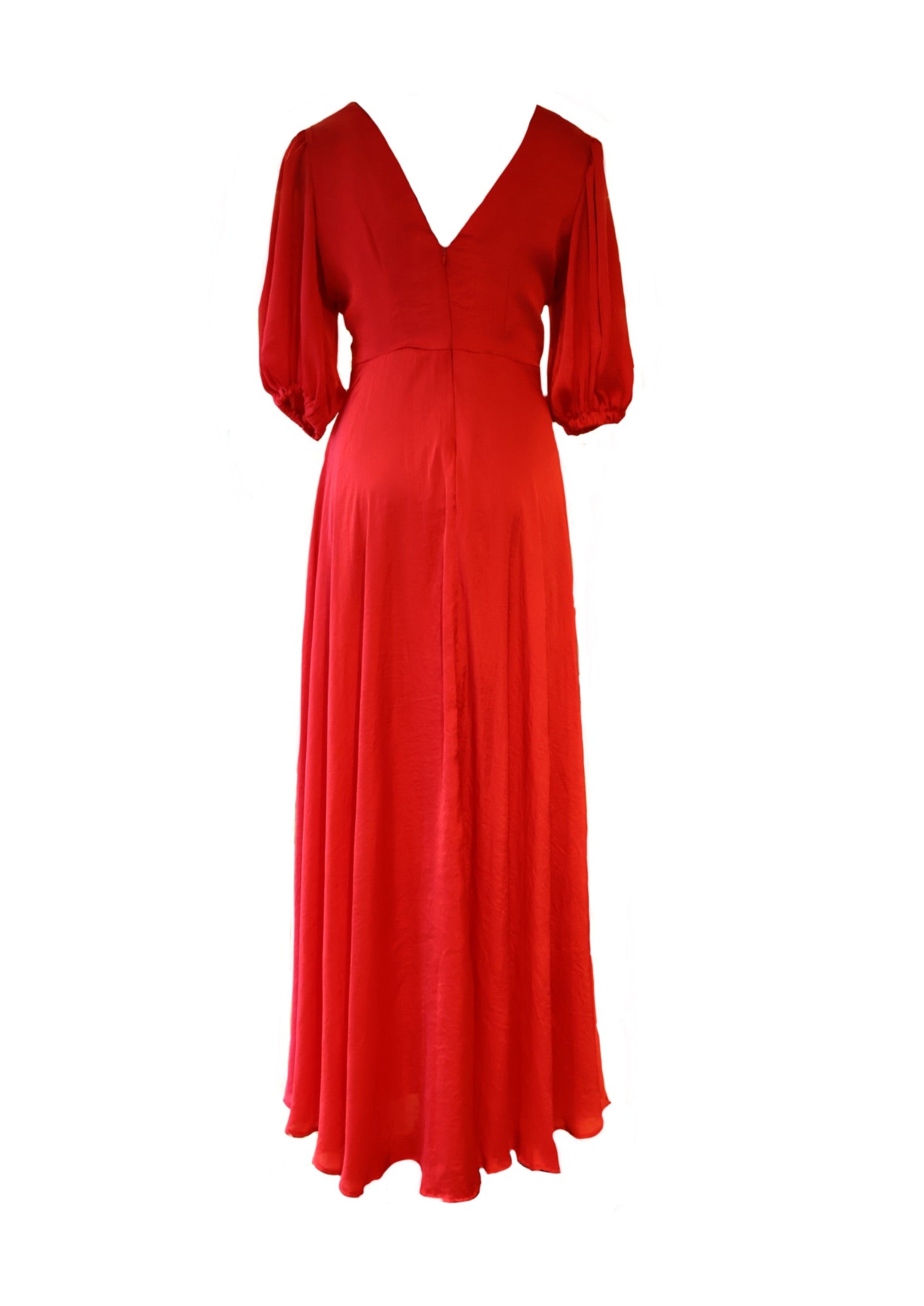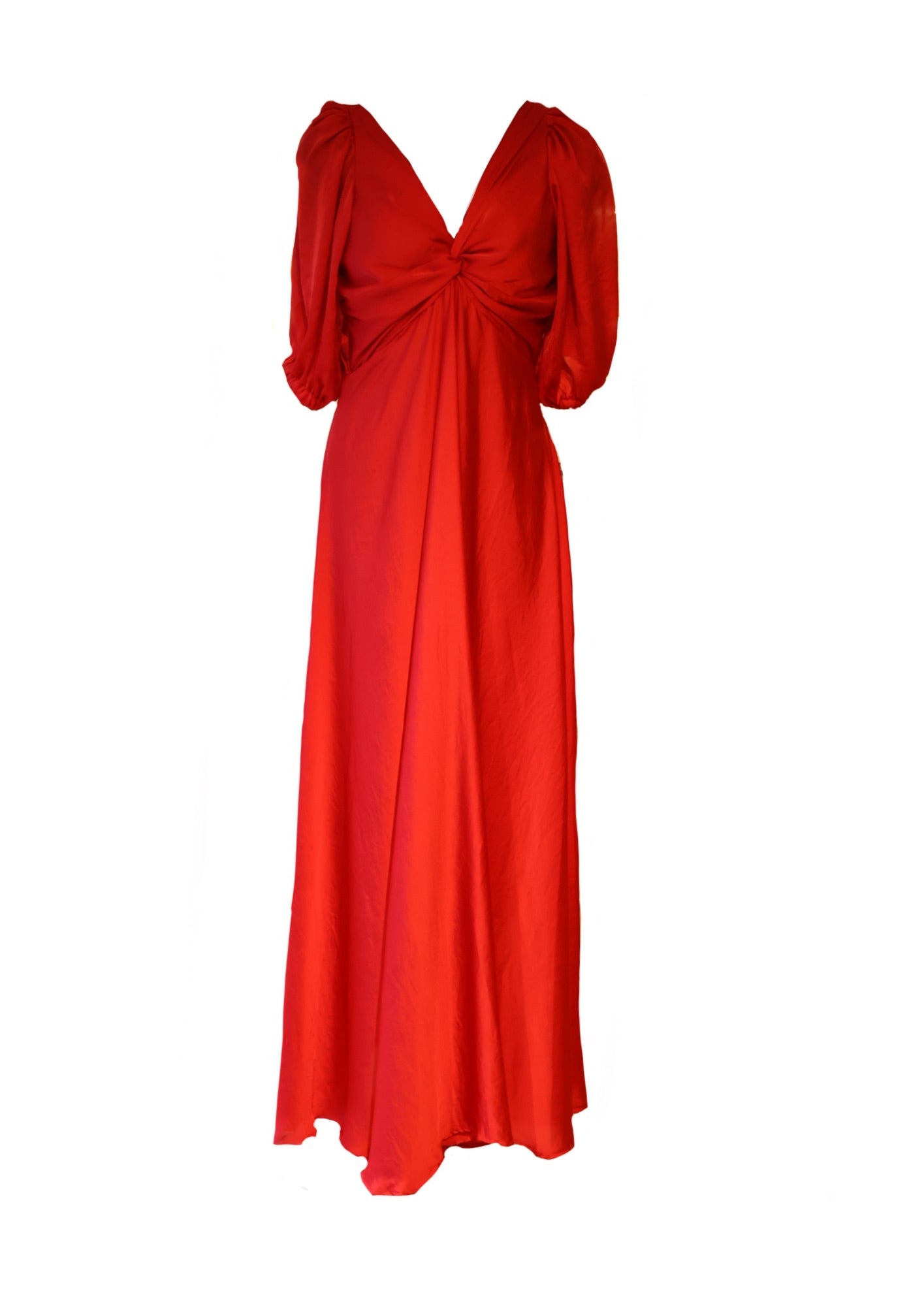 Un vestido midi de un intenso color rojo, que combina elementos clásicos con un toque moderno. Su diseño con drapeado en el centro y las mangas abullonadas le dan un aire sofisticado y sensual. Perfecto para diversas ocasiones, desde eventos formales hasta salidas nocturnas.