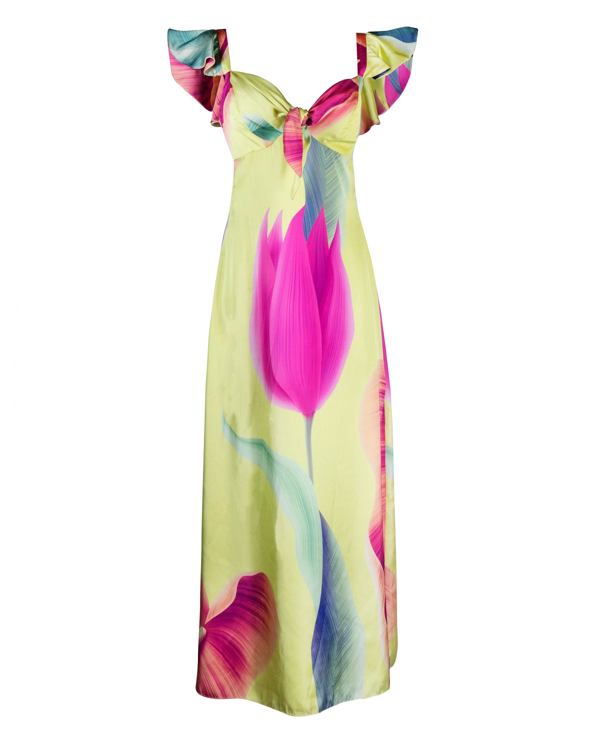 Este elegante vestido largo en seda es la elección perfecta para eventos de verano. Con un vibrante estampado en tonos morados y azules sobre un fondo verde fresco, el vestido ofrece un diseño alegre y sofisticado que captura el espíritu de la temporada. La seda, con su caída fluida y ligera, proporciona comodidad y un aire de lujo, ideal para eventos al aire libre o cenas estivales. Su estilo fluido y el estampado llamativo aseguran que te sientas tanto fresca como a la moda en cualquier ocasión veraniega.