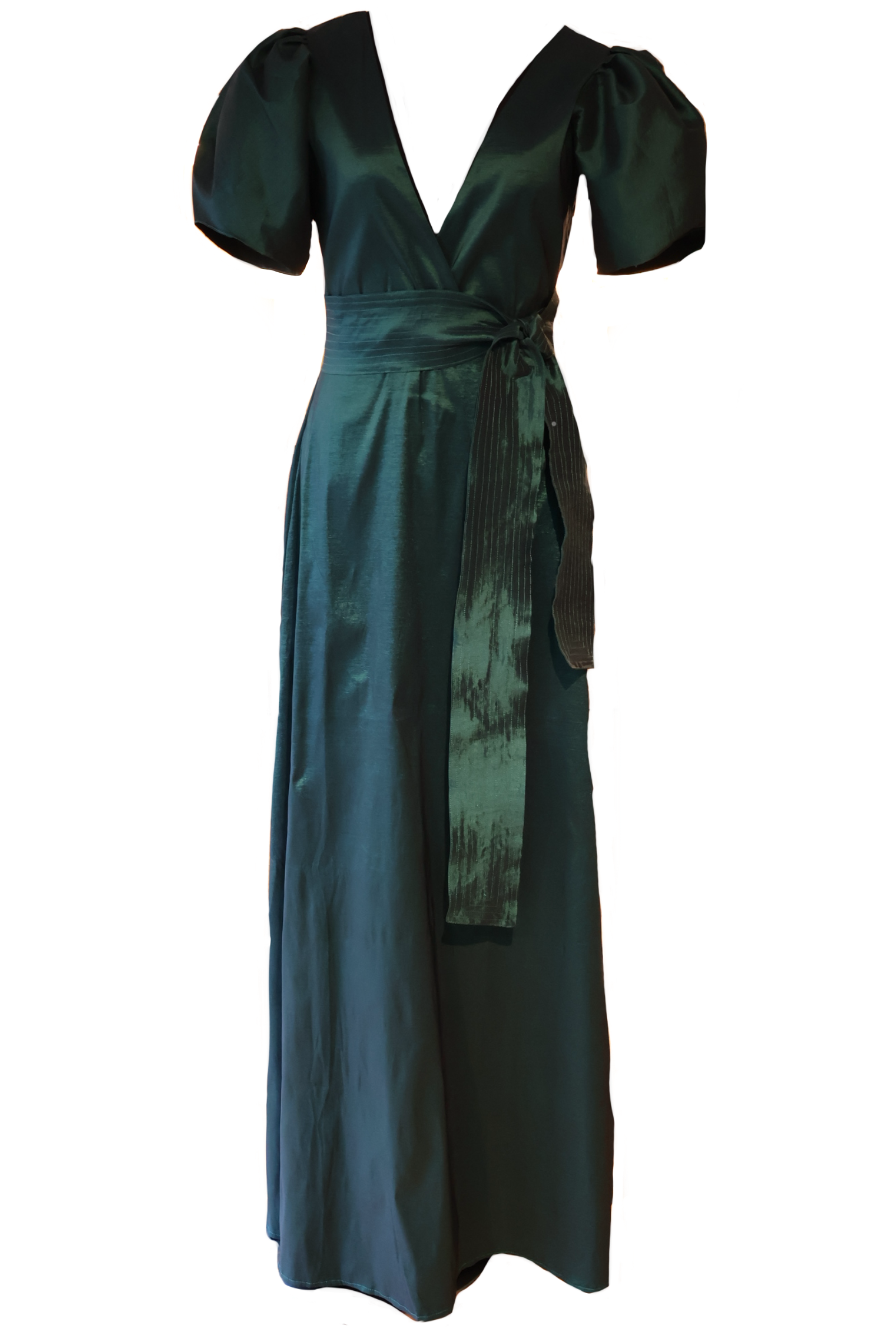 Vestido largo de silueta envolvente, confeccionado en tejido de satén de seda en un profundo tono verde esmeralda. Presenta un escote en V pronunciado y mangas cortas abullonadas que aportan volumen y sofisticación. La cintura está definida por un cinturón ancho del mismo tejido, que se anuda a un lado creando una caída asimétrica y elegante. Ideal para mujeres que buscan un vestido elegante y atemporal, con un toque de romanticismo y sofisticación.