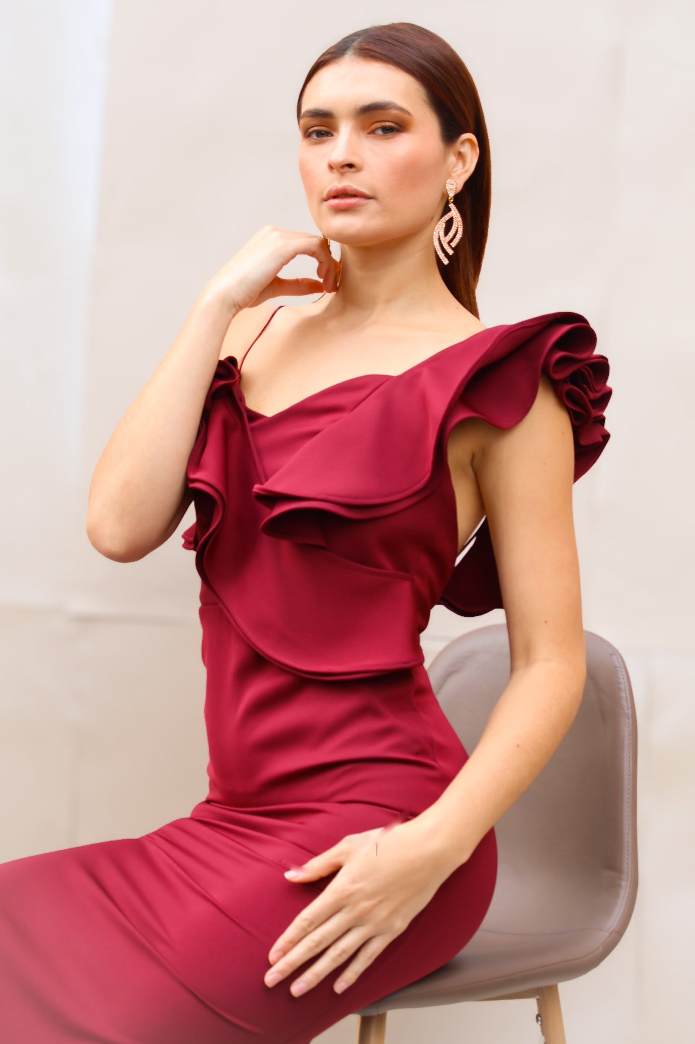 Vestido en color Vinotinto con bolero en hombro, ideal para un evento en la noche. Su tela hace que la mujer luzca con estilo y delicadeza. Material armani.